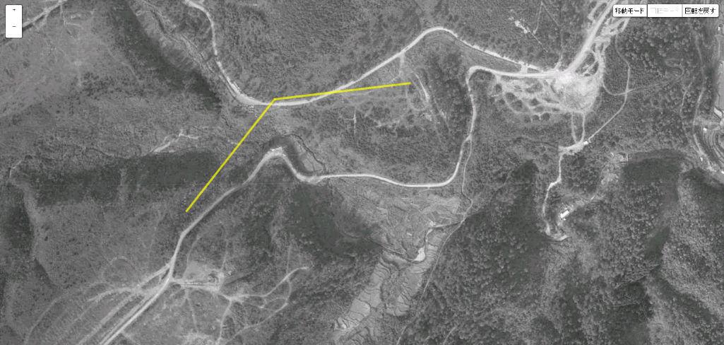 | 国土地理院の「国土変遷アーカイブ」による現地周辺の1961年撮影の航空写真。黄色い画角で撮っていると思う。 ↓ |