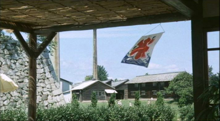 国土地理院の「国土変遷アーカイブ」による現地周辺の1975年撮影の航空写真。黄色い矢印方向に撮っている。高い煙突の影が見える。なおこの工場はすでに存在しない。