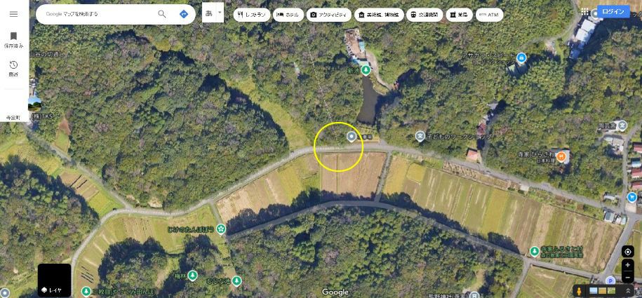 グーグルの空中写真の画像。黄色い円内が推定ロケ地。