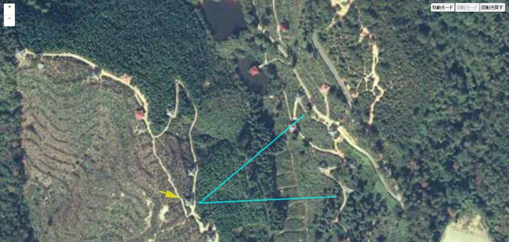 国土地理院の「国土変遷アーカイブ」による現地周辺の1982年撮影の航空写真。黄色い矢印が井戸寺。水色の画角で撮っていると思う。