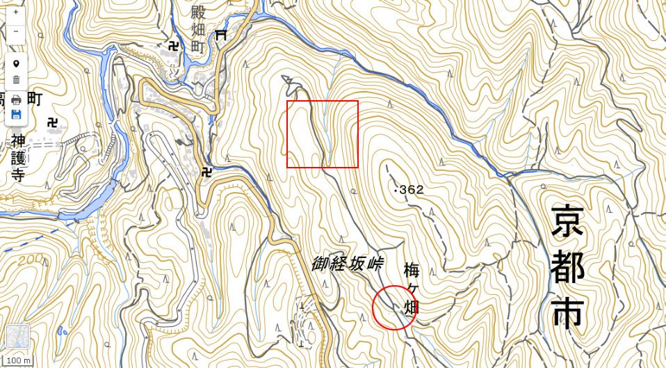 | 赤い四角がロケ推定地。本編画像は南から北を見ている。等高線から判断すると、道は平坦で右手はかなり急峻な谷。 ↓ |