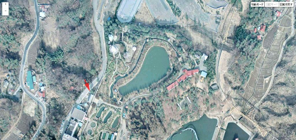 | 国土地理院の「国土変遷アーカイブ」による現地周辺の1974年撮影の航空写真。赤い矢印が屋敷門。 ↓ |