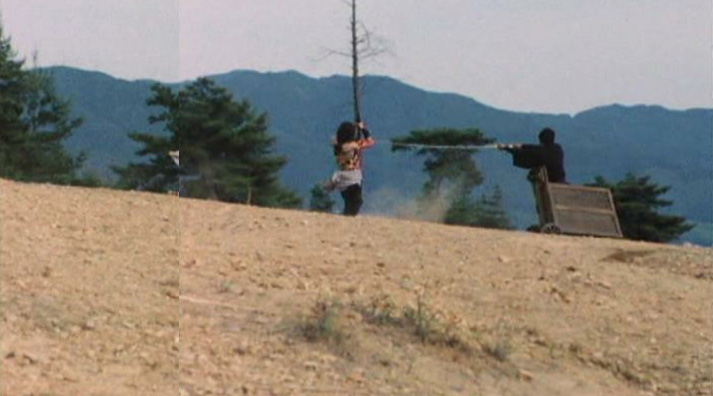 「おしどり右京捕物車」のシーン。右手の山並みに注目。