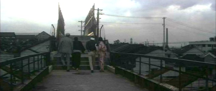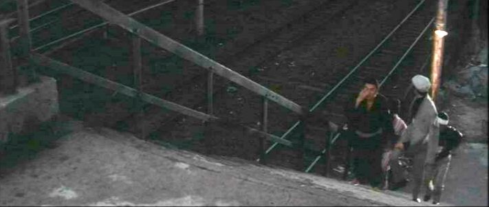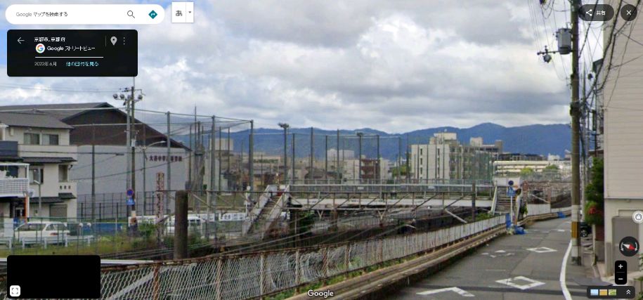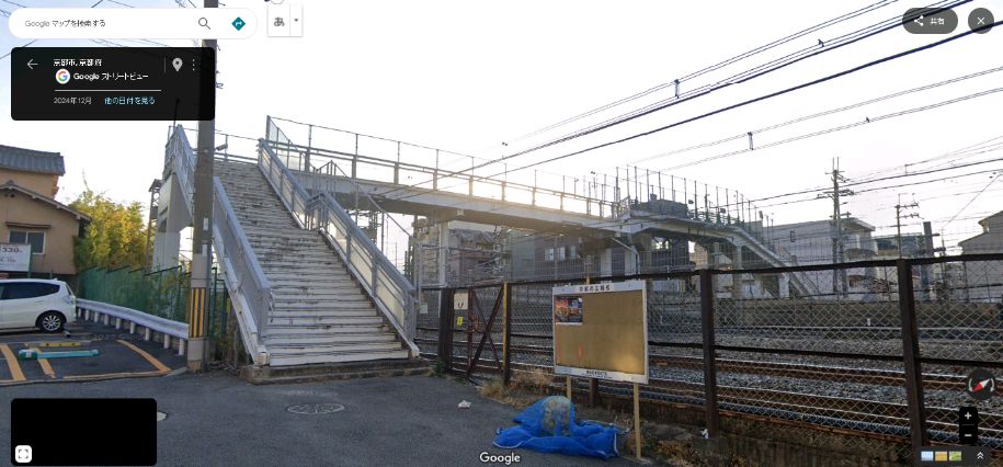 | 「京都市東山区本町9丁目」の歩行者用跨線橋。奥の一段高い線路は新幹線。 ↓ |