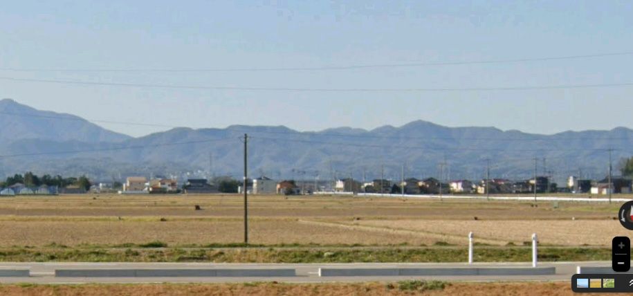 | グーグル・ストリートビューの画像。山並みが一致。(現地は見通しが悪いので、やや東から取得した画像) ↓ |
