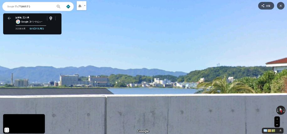 | 「石川県加賀市片山津温泉」の柴山潟の南西。どこかのホテルの屋上。柴山潟干拓の最中らしく、まだ北に水面が伸びている。 ↓ |