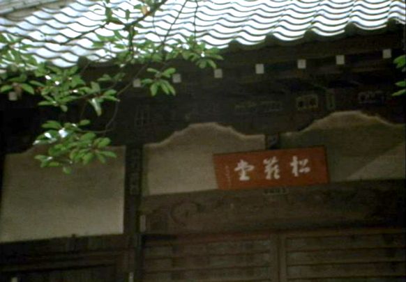 「東京都稲城市矢野口」の妙覚寺の墓地。手前は鐘楼。