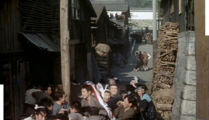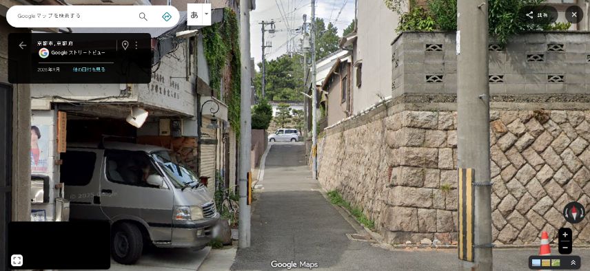 | 「京都市中京区西ノ京職司町」の路地。奥に見えるのは二条城の西南隅櫓。 ↓ |