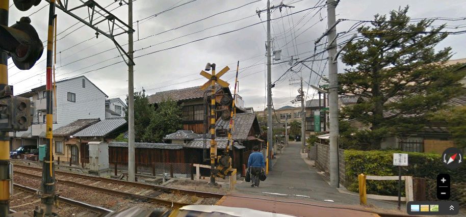 | 京福電鉄・帷子ノ辻駅から西へ2本目の踏切。音川さんは嵯峨柳田町からこちらへ転居したらしい。 ↓ |