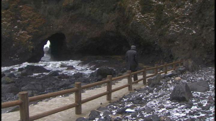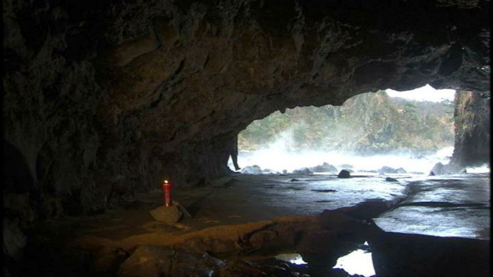 「石川県羽咋郡志賀町富来牛下」の「巌門(がんもん)」。「鷹の巣岩」も映っている。 ↓ |