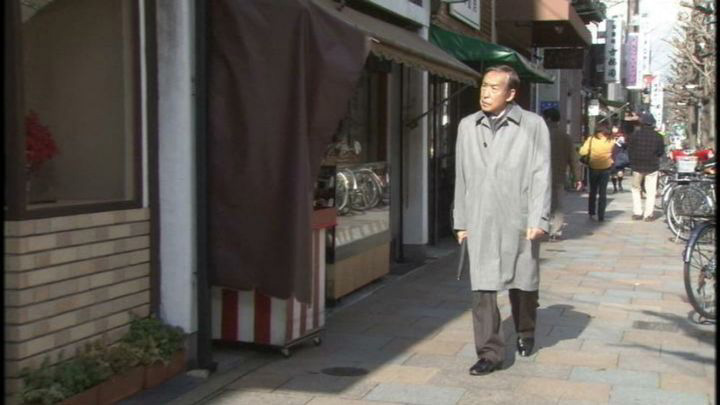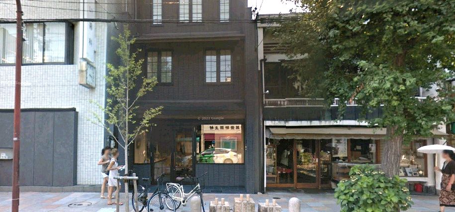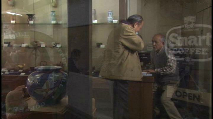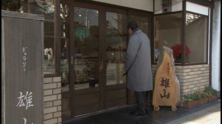 「京都市中京区要法寺前町」の古美術「ながた」。ロケ協力クレジットあり。お向かいの「村上開新堂」が映っている。 ↓ |