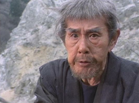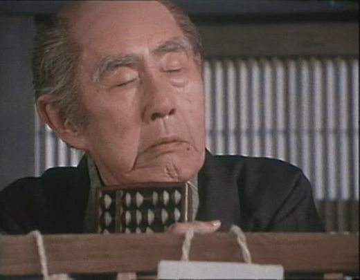 | 「座頭市と用心棒」(1970年)の嵐寛寿郎。地蔵を彫る石工役が木枯し紋次郎とダブる。 |