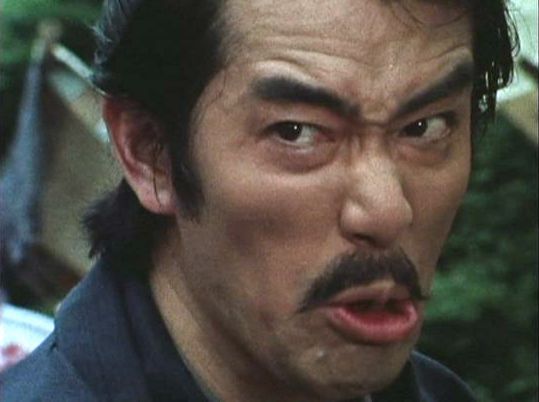 | 「桃太郎侍」の「第66話 嘘とまことの仇討悲願」(1978年)の中村敦夫。付け髭で騙りの猿芝居。思いっきりわざとらしい。 |